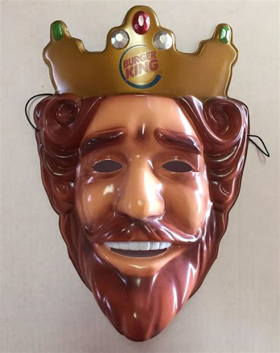 The Burger King mask is a mask designed to look like the face of the Burger King mascot, which is a character used in advertising campaigns for the fast-food chain Burger King.
